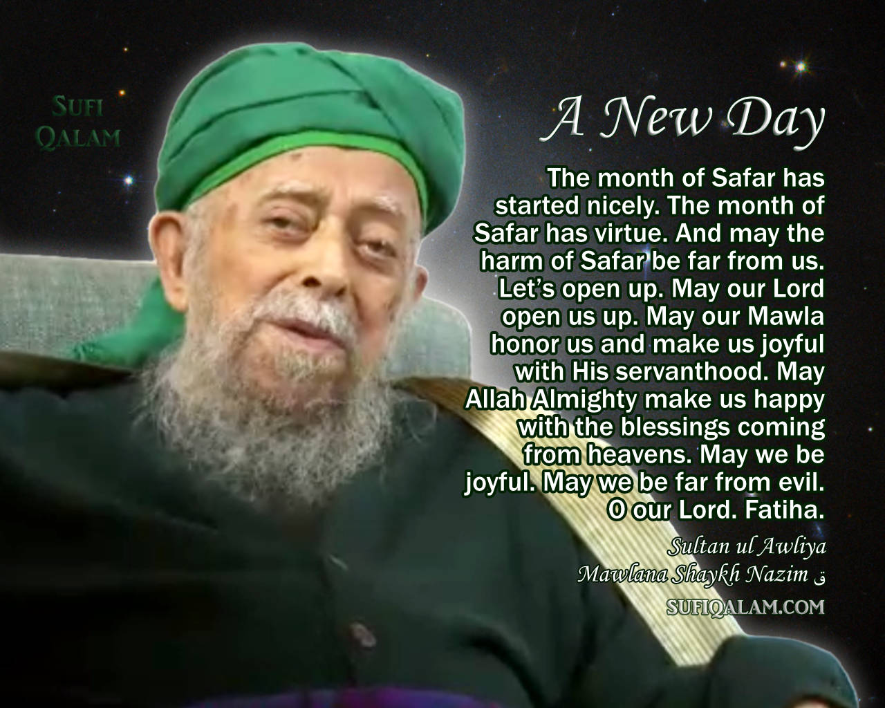 O Allah, our Subhan, our Sultan. May Safar be blessed for all of us. The month of Safar has whips that will put the whole world in order. The whips are punishing mankind. Let’s say “Bismillahi r-Rahmani r-Rahim” and open up. Let’s be lions at Allah’s door. Let’s be servants. O our Lord. Fatiha.