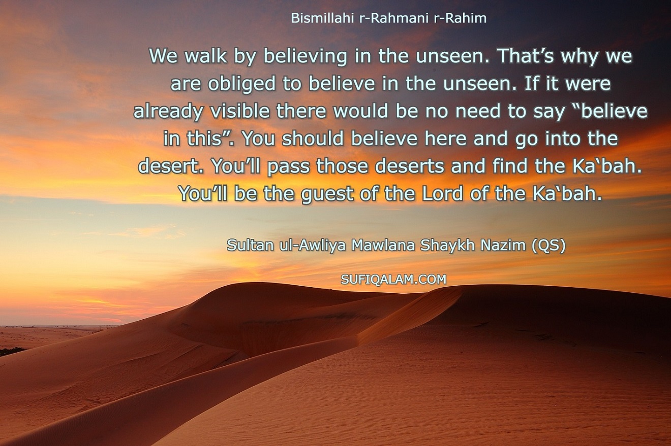 The moment we sit here, like you pressing these buttons, rābiṭah (connection) is given to our hearts, we are translating his words to you. Translating is our duty. If you move out of the way, what kind of manifestations you’ll see. It is as if there is a fort in front of you. When we stand in front of a fort how will we see beyond the fort? That’s why Allāh says “Believe in the unseen”. We believe in the unseen. By believing more and more in the unseen the curtains of the ego are opened. When dark curtains are removed the unseen will be clearly seen. When the curtains are opened, what you believe will be seen. Yes, everyone, who took this way, started by believing in the unseen. They said there is a Ka‘bah over there, walk and see if you reach the glorious Ka‘bah. In the old times they went to the desert. The camels and ḥujjāj passed through the desert, sinking into the sand up to their knees, believing in the Ka‘bah that they didn’t see. They passed through the desert with love. Finally they would find the Ka‘bah.