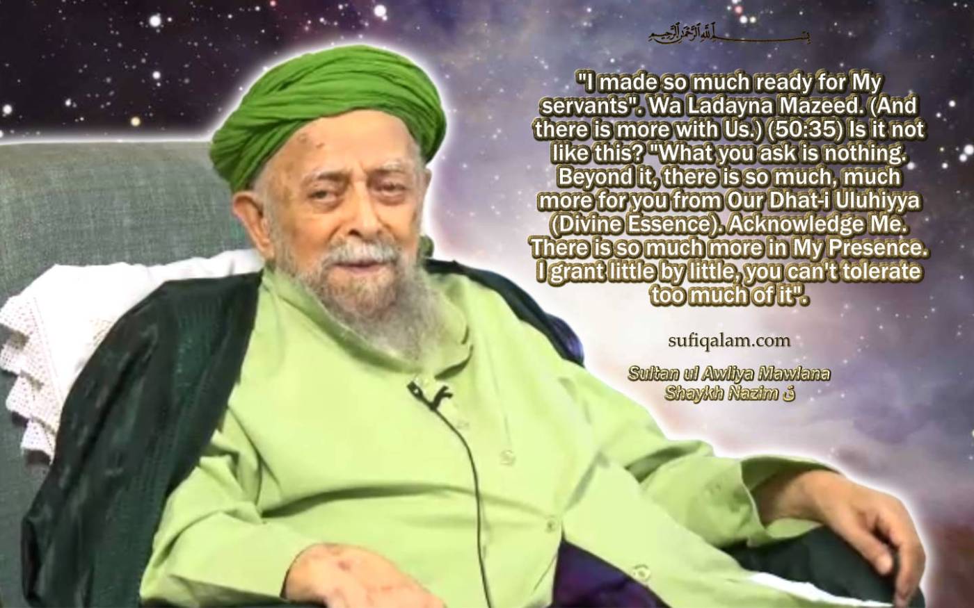 Go ahead O Shahi Mardan? “What do you want, O My servant?” asks Allah Almighty. “I need You, only You O our Lord” Yunus (Emre) would say. What should I ask for? He can’t say, “I need You”- can man not say “We want You, O Lord, only You. You created us, immersed us in Your blessings. I need You, only You” would say Yunus. What is there to ask for in dunya? May the Nur of faith shine on your face. May your face & eyes be opened. Say “All Praise be to my Lord that He created me”. Make sajda, make ruku. Praise Him, and say Bismillahi r-Rahmani r-Rahim. Go ahead O Shahi Mardan. This is a sohbat according to our level. Your level increases? Then your love increases. After your level increases, your nearness increases and you want to get nearer. You want more love, more love. Hal min mazeed- (50:30) (Is there any more?) “We want more, O our Lord”.