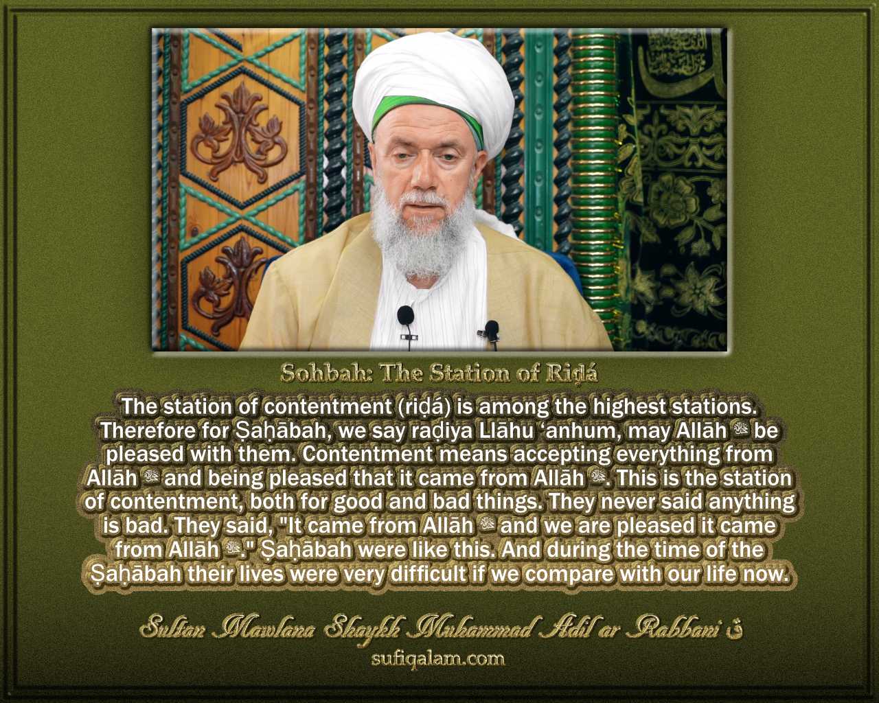 The station of contentment (riḍá) is among the highest stations. Therefore for Ṣaḥābah, we say raḍiya Llāhu ‘anhum, may Allāh ﷻ be pleased with them. Contentment means accepting everything from Allāh ﷻ and being pleased that it came from Allāh ﷻ. This is the station of contentment, both for good and bad things. They never said anything is bad. They said, “It came from Allāh ﷻ and we are pleased it came from Allāh ﷻ.” Ṣaḥābah were like this. And during the time of the Ṣaḥābah their lives were very difficult if we compare with our life now.