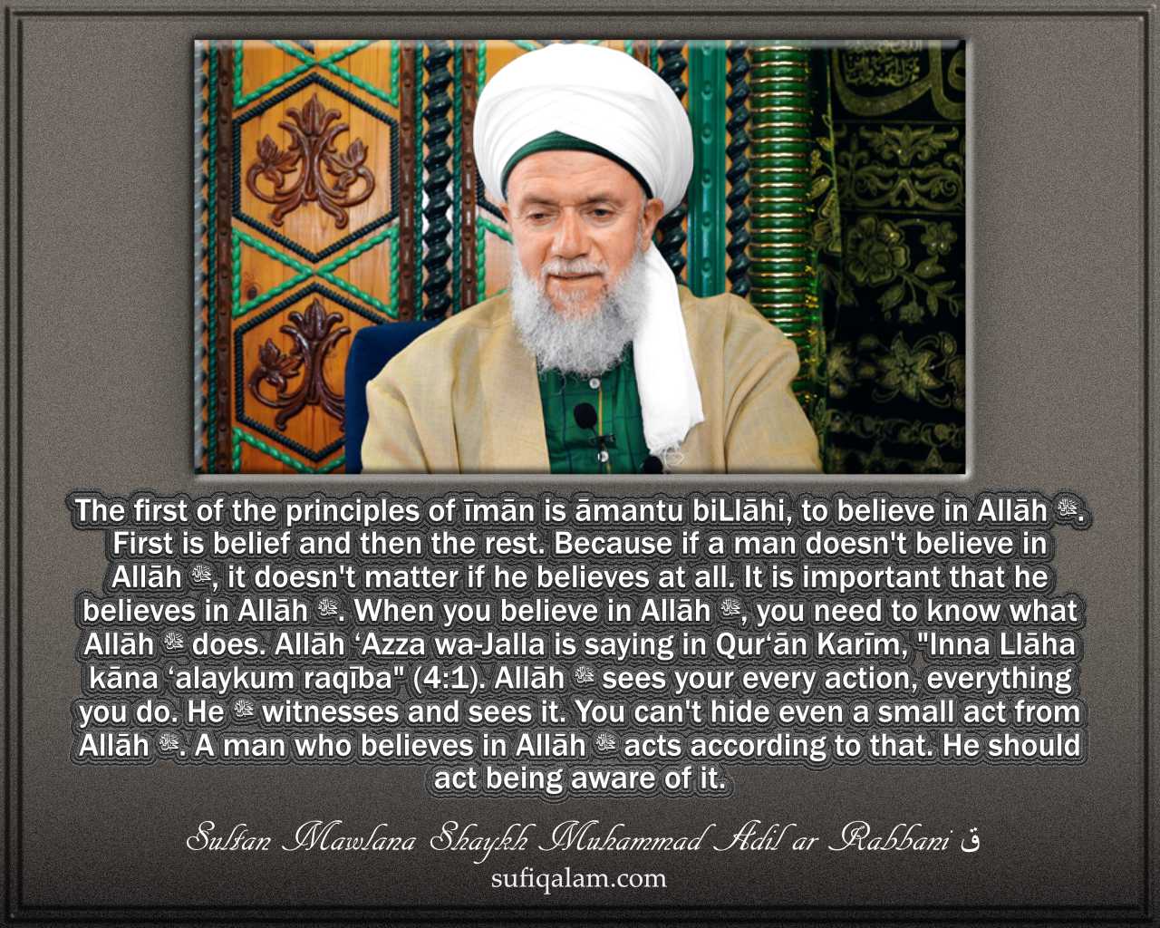 Allāh ‘Azza wa-Jalla… First thing to we have believe six things: Āmantu biLlāhi wa-malā’ikatihi wa-kutubihi wa-rusulihi wa-l-yawmi l-ākhiri – this. First thing we must believe in our Creator, Allāh ‘Azza wa-Jalla. If you not believe in Him ﷻ, other is not important. But when you believe, you must believe who is Mightiness, Allāh ‘Azza wa-Jalla Mightiness, how He ﷻ is saying in Qur’ān – first what you must believe: Bismi Llāhi r-Raḥmāni r-Raḥīm. “Inna Llāha kāna ‘alaykum raqība” (4:1). This verse is in Qur’ān, Sūratu n-Nisā’. Allāh ﷻ meaning, [He ﷻ] seeing whole time with you. What you do – everything – He ﷻ is seeing. You cannot hide anything. Who believe in this, he will be careful for what he is doing – what is good, what not good, how behave for everything, not only for human being, for everything. This is very small verses but if somebody taking this and do it, he is following the strong belief of Allāh ﷻ.