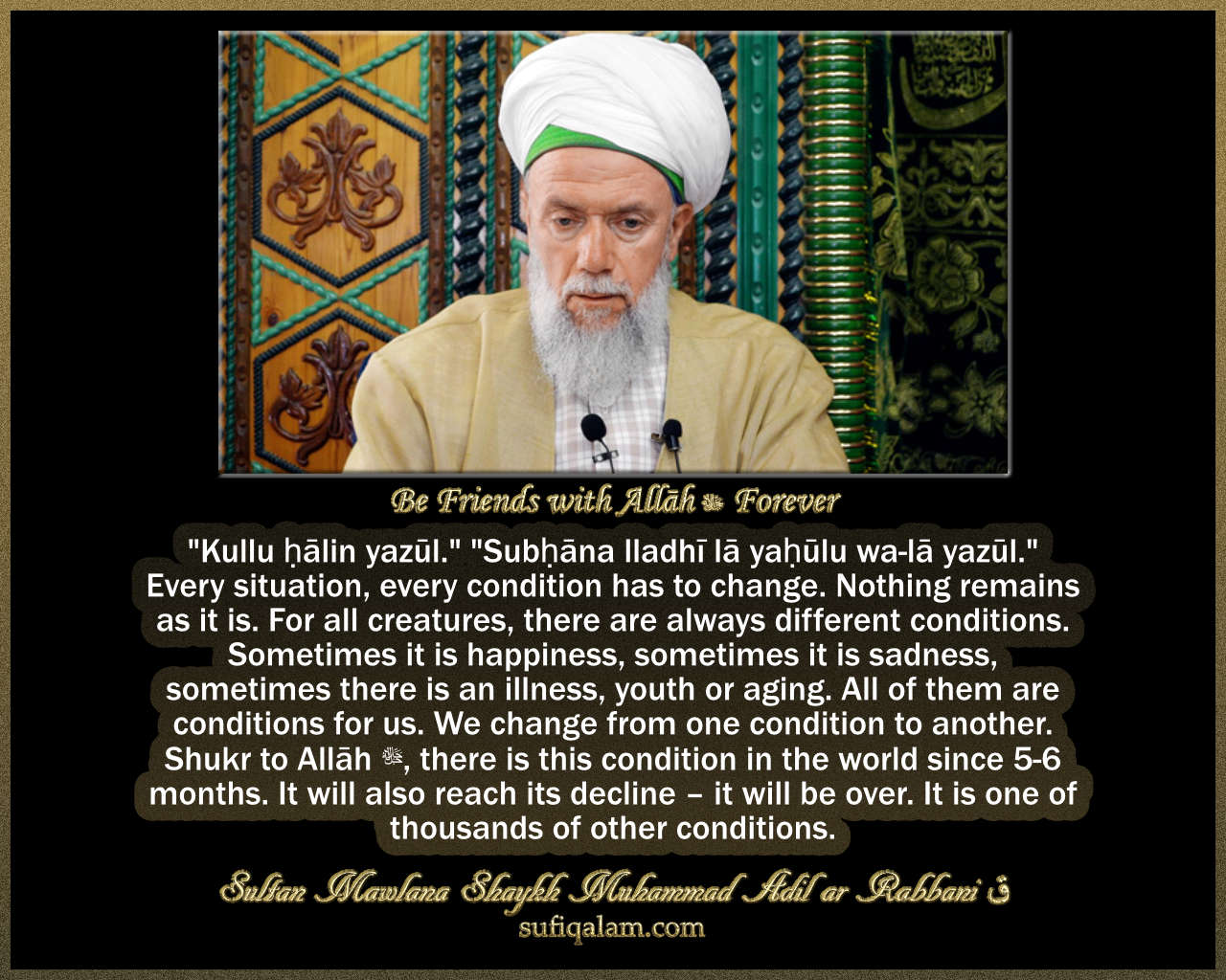 “Kullu ḥālin yazūl.” “Subḥāna lladhī lā yaḥūlu wa-lā yazūl.” Every situation, every condition has to change. Nothing remains as it is. For all creatures, there are always different conditions. Sometimes it is happiness, sometimes it is sadness, sometimes there is an illness, youth or aging. All of them are conditions for us. We change from one condition to another. Shukr to Allāh ﷻ, there is this condition in the world since 5-6 months. It will also reach its decline – it will be over. It is one of thousands of other conditions.