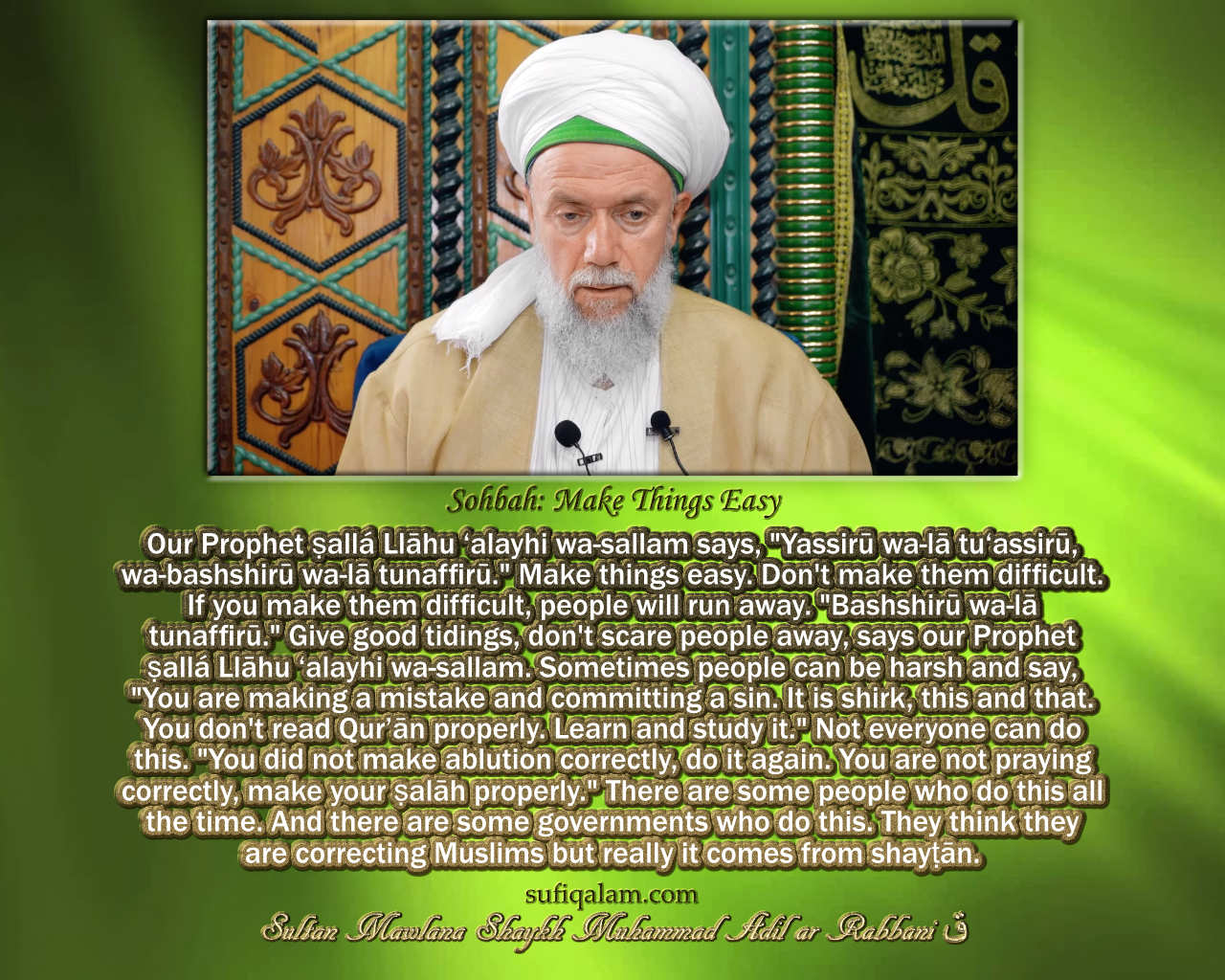 Our Prophet ṣallá Llāhu ‘alayhi wa-sallam says, “Yassirū wa-lā tu‘assirū, wa-bashshirū wa-lā tunaffirū.” Make things easy. Don’t make them difficult. If you make them difficult, people will run away. “Bashshirū wa-lā tunaffirū.” Give good tidings, don’t scare people away, says our Prophet ṣallá Llāhu ‘alayhi wa-sallam. Sometimes people can be harsh and say, “You are making a mistake and committing a sin. It is shirk, this and that. You don’t read Qur’ān properly. Learn and study it.” Not everyone can do this. “You did not make ablution correctly, do it again. You are not praying correctly, make your ṣalāh properly.” There are some people who do this all the time. And there are some governments who do this. They think they are correcting Muslims but really it comes from shayṭān.