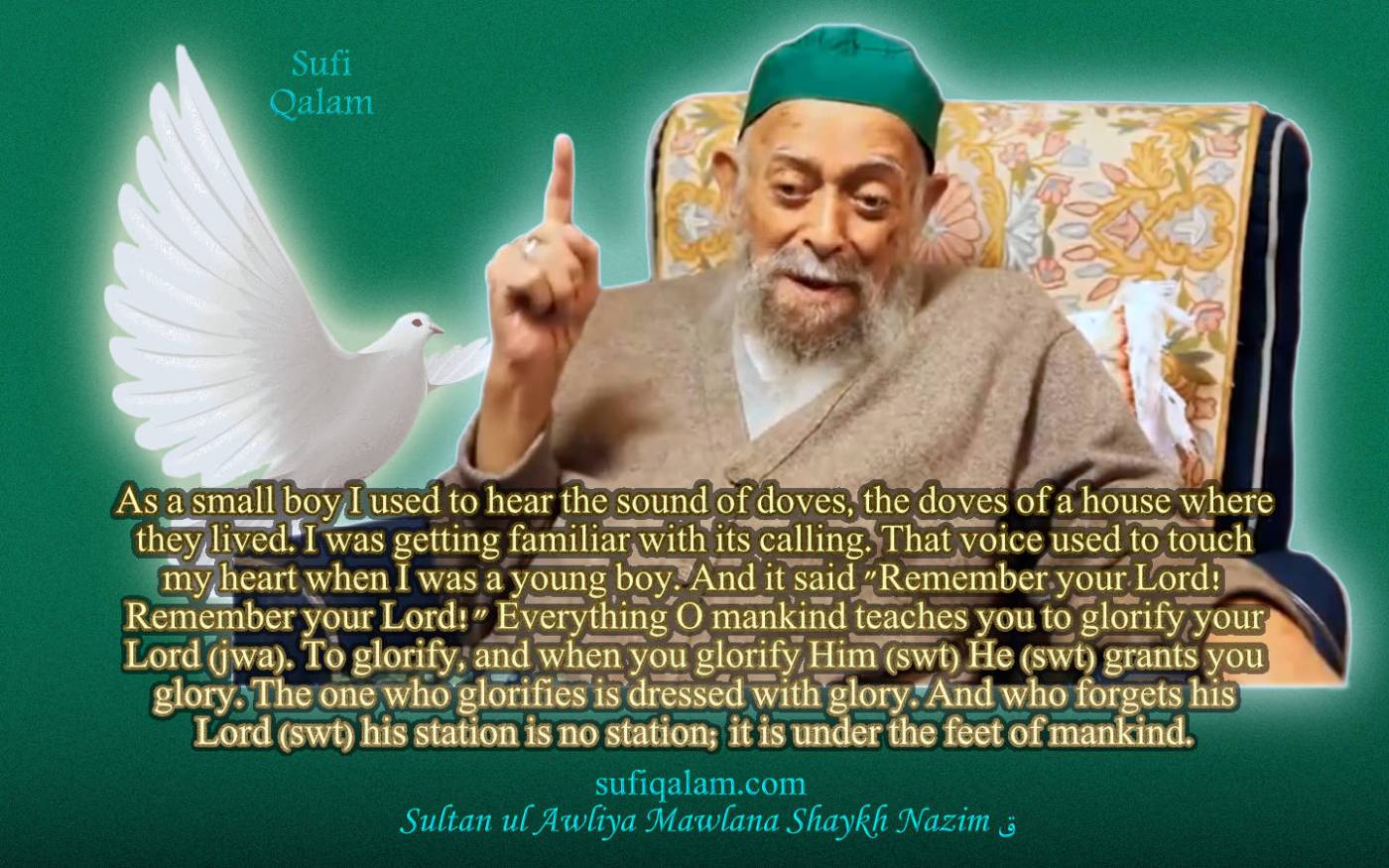 As a small boy I used to hear the sound of doves, the doves of a house where they lived. I was getting familiar with its calling. That voice used to touch my heart when I was a young boy. And it said “Remember your Lord! Remember your Lord!” Everything O mankind teaches you to glorify your Lord (jwa). To glorify, and when you glorify Him (swt) He (swt) grants you glory. The one who glorifies is dressed with glory. And who forgets his Lord (swt) his station is no station; it is under the feet of mankind.