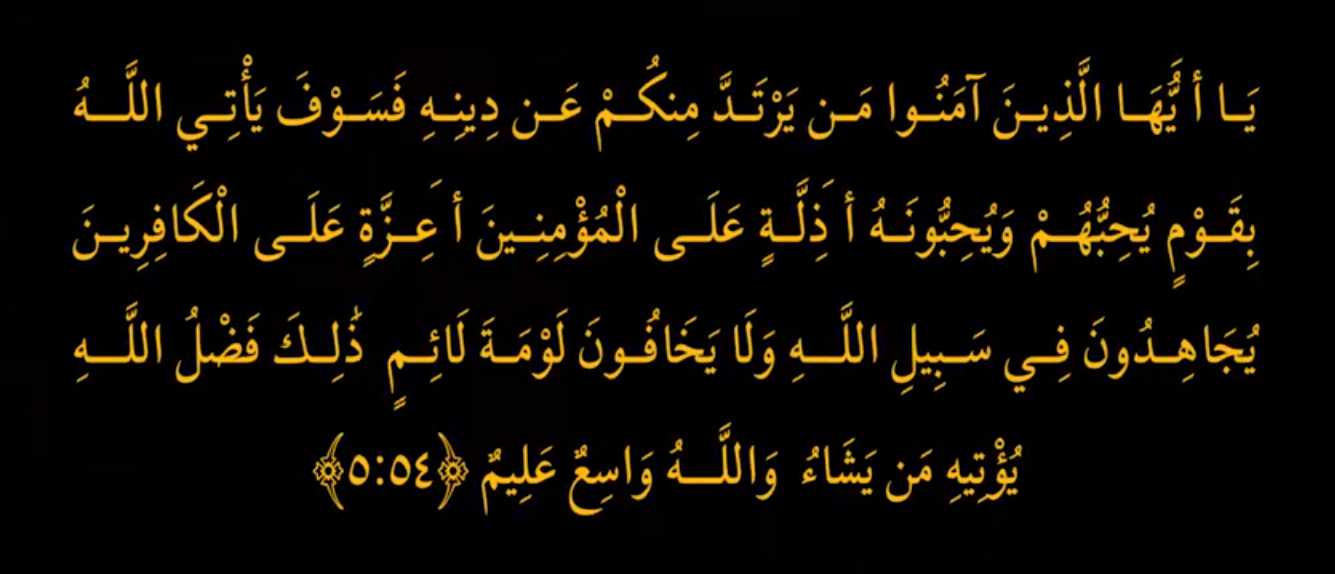 “O you who believe! Whoever from among you turns back from his religion, Allah will bring a people whom He will love and they will love Him; humble towards the believers, stern towards the disbelievers, fighting in the Way of Allah, and never afraid of the blame of the blamers. That is the Grace of Allah that He bestows on whom He wills. And Allah is All-Sufficient for His creatures’ needs, All-Knower” (5:54).