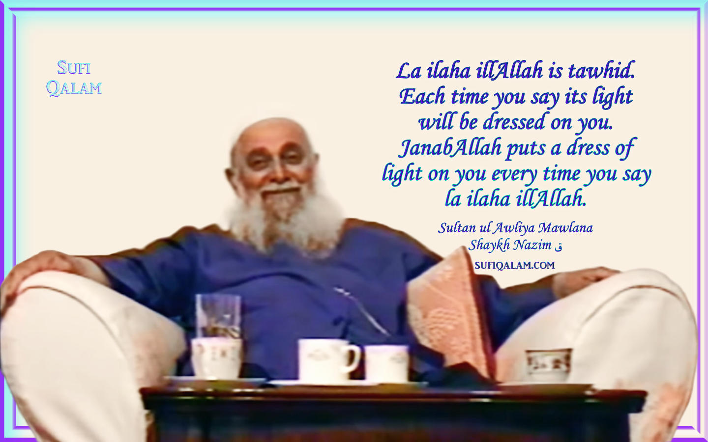La ilaha illAllah is tawhid. Each time you say its light will be dressed on you. JanabAllah puts a dress of light on you every time you say la ilaha illAllah. How shall we wear such a dress? It has the light of 500 candles inside it. When the light of 500 candles comes, will it be too small here for this light? If you put the light of 50,000 candles inside it, will this place be too small for 50,000 candles? No, it won’t. Light doesn’t have a capacity – to be too much or not. Just like this, when they put a dress of light on you, you can wear 1,000 dresses, your light will increase. There won’t be heaviness. You will be light. When you put light on, you’ll become light. Your heaviness will be gone. It will become light. Can a person fly? Can a man make something fly and not fly himself? Mankind is making iron fly. Can he not fly himself? If you say he cannot, you’re mistaken.